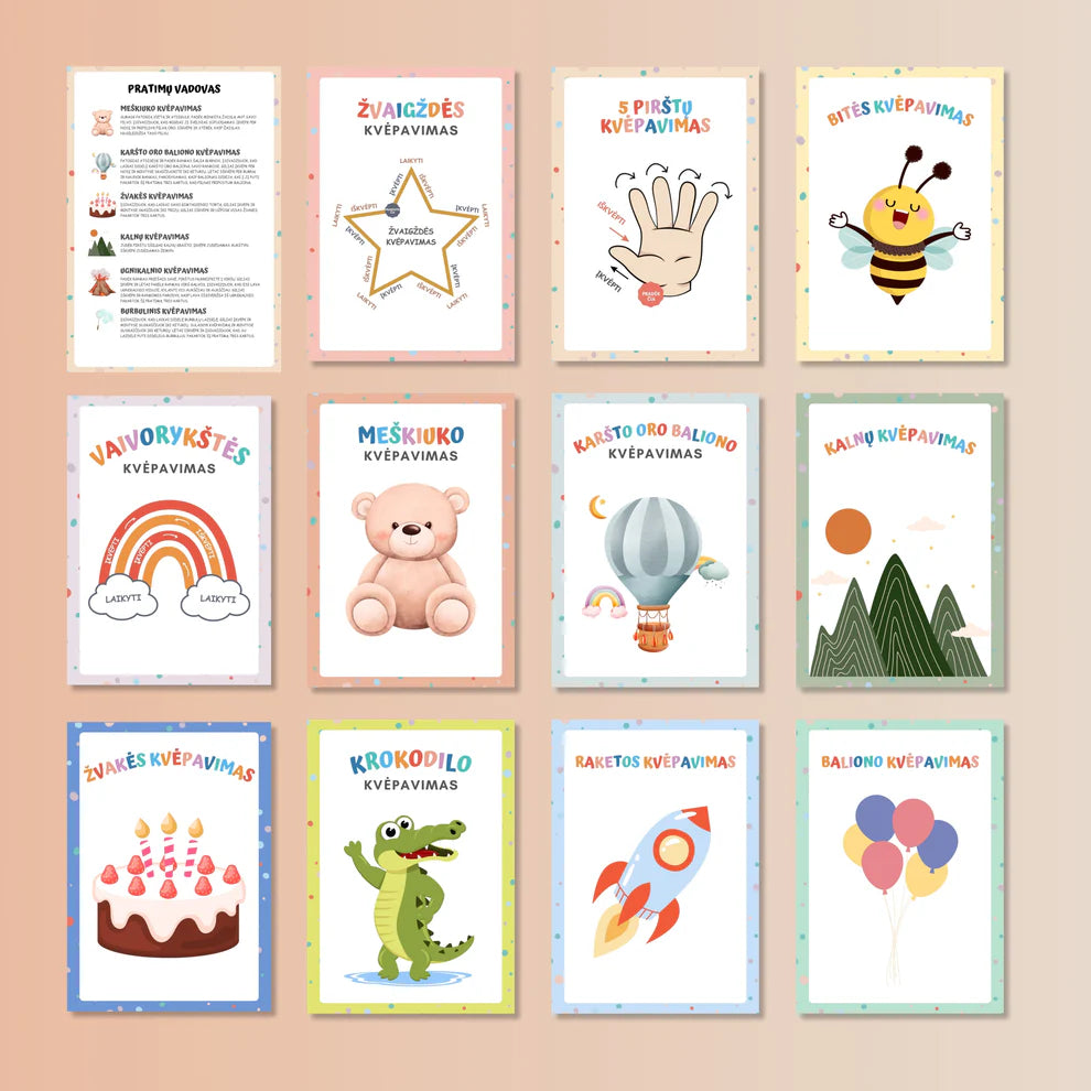 Kortelių rinkinys apima įvairius kvėpavimo pratimus, sukurtus patraukti vaikų dėmesį ir vaizduotę.